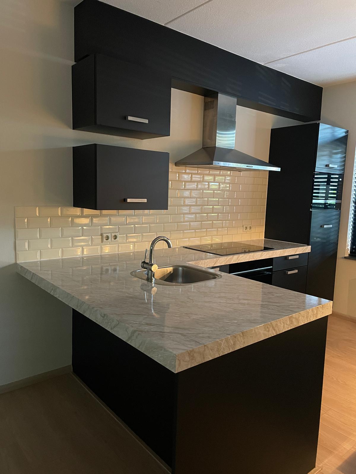 Deze keuken kreeg een stijlvolle make-over met een combinatie van marmerlook folie en mat zwarte accenten. De luxe uitstraling van natuursteen wordt perfect aangevuld door het moderne, strakke zwart, waardoor een tijdloos en verfijnd design ontstaat. Een duurzame en betaalbare transformatie zonder ingrijpende renovatie!